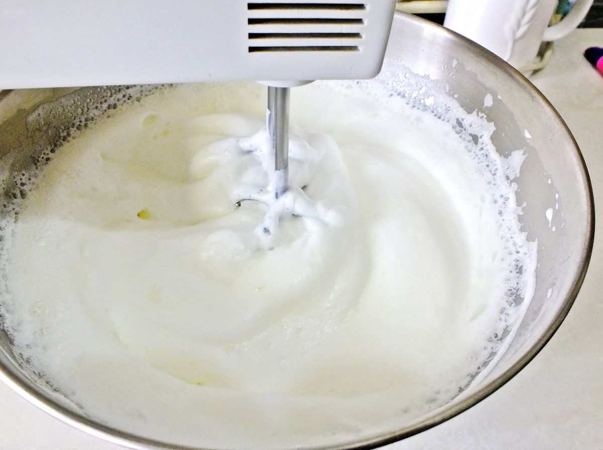 加入檸檬汁(白醋亦可),打至粗泡後再將細砂糖分次加入打發~接近乾性發泡的程度即可。