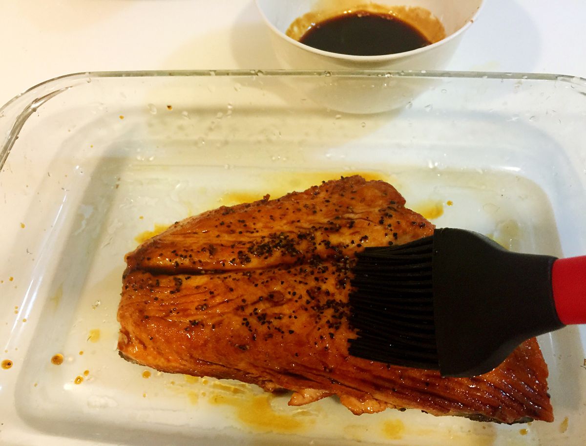 將鮭魚放入烤盤,一面刷上照燒醬,入烤箱烤10分鐘