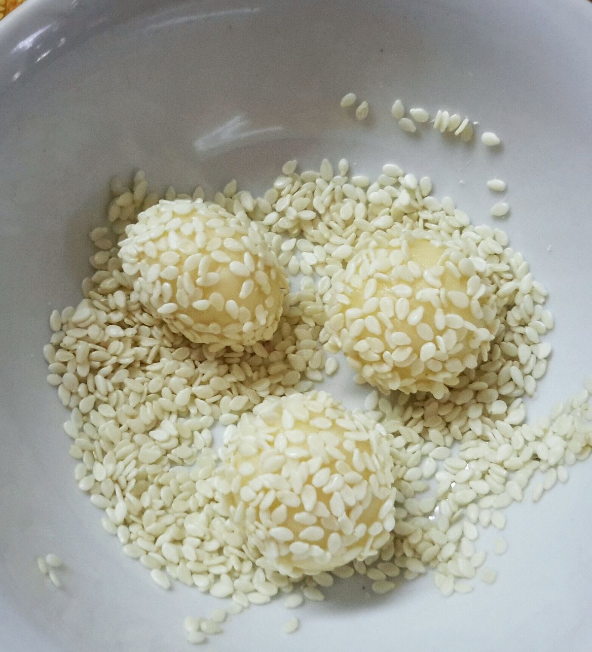 在麵糰表面沾少許水,再沾滿芝麻,用雙手搓揉一下