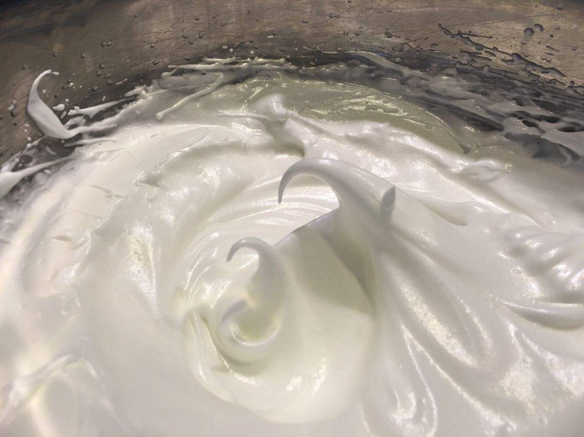 此時開始打蛋白霜. 蛋白先用打蛋器打出一些粗泡,然後分2次加入細砂糖打成尾端挺立的蛋白霜(乾性發泡, 如圖)
