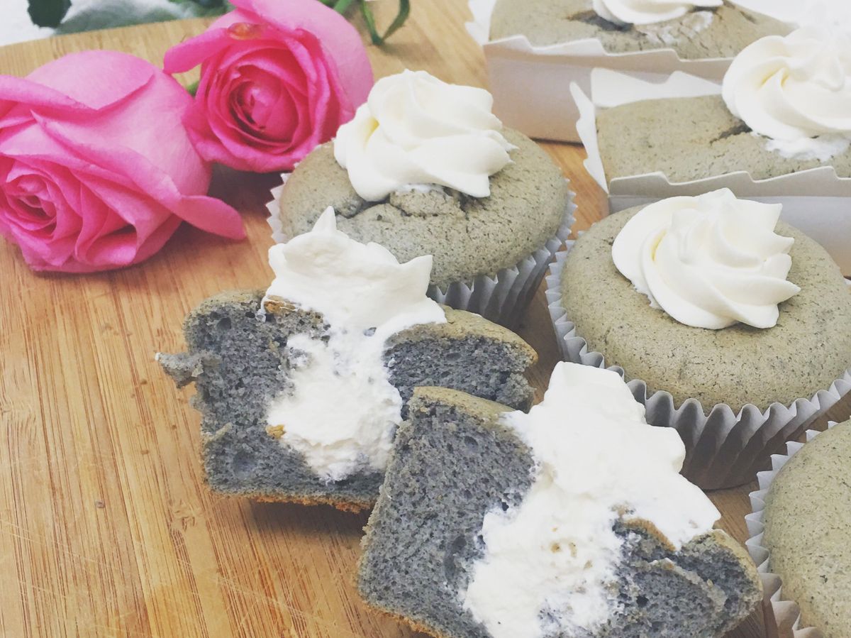 鮮奶油加糖粉打發裝進擠花嘴袋再插入蛋糕中,將適量的鮮奶油擠入杯子蛋糕