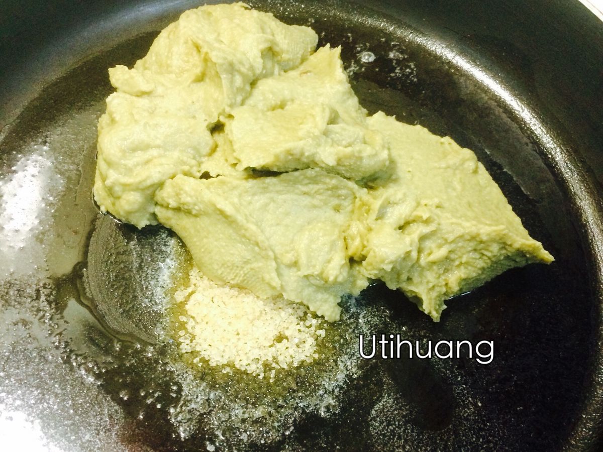 (打好的綠豆泥如圖,不會太濕)材料B 將無鹽奶油置入剛開火的鍋,融化至液態關火 再放砂糖 綠豆泥 稍加拌勻,開中小火將糖及奶油都加熱不斷攪拌融入綠豆泥