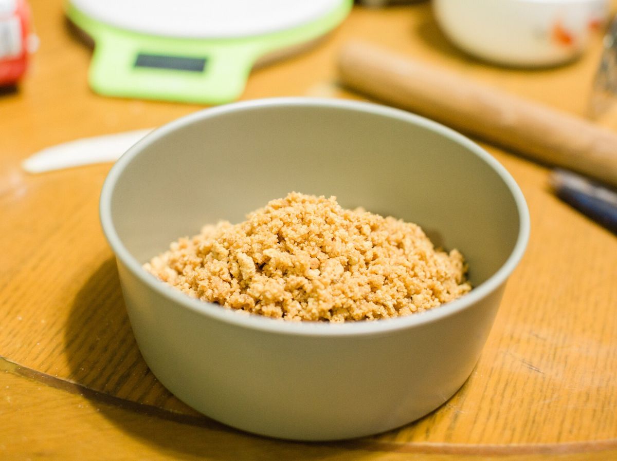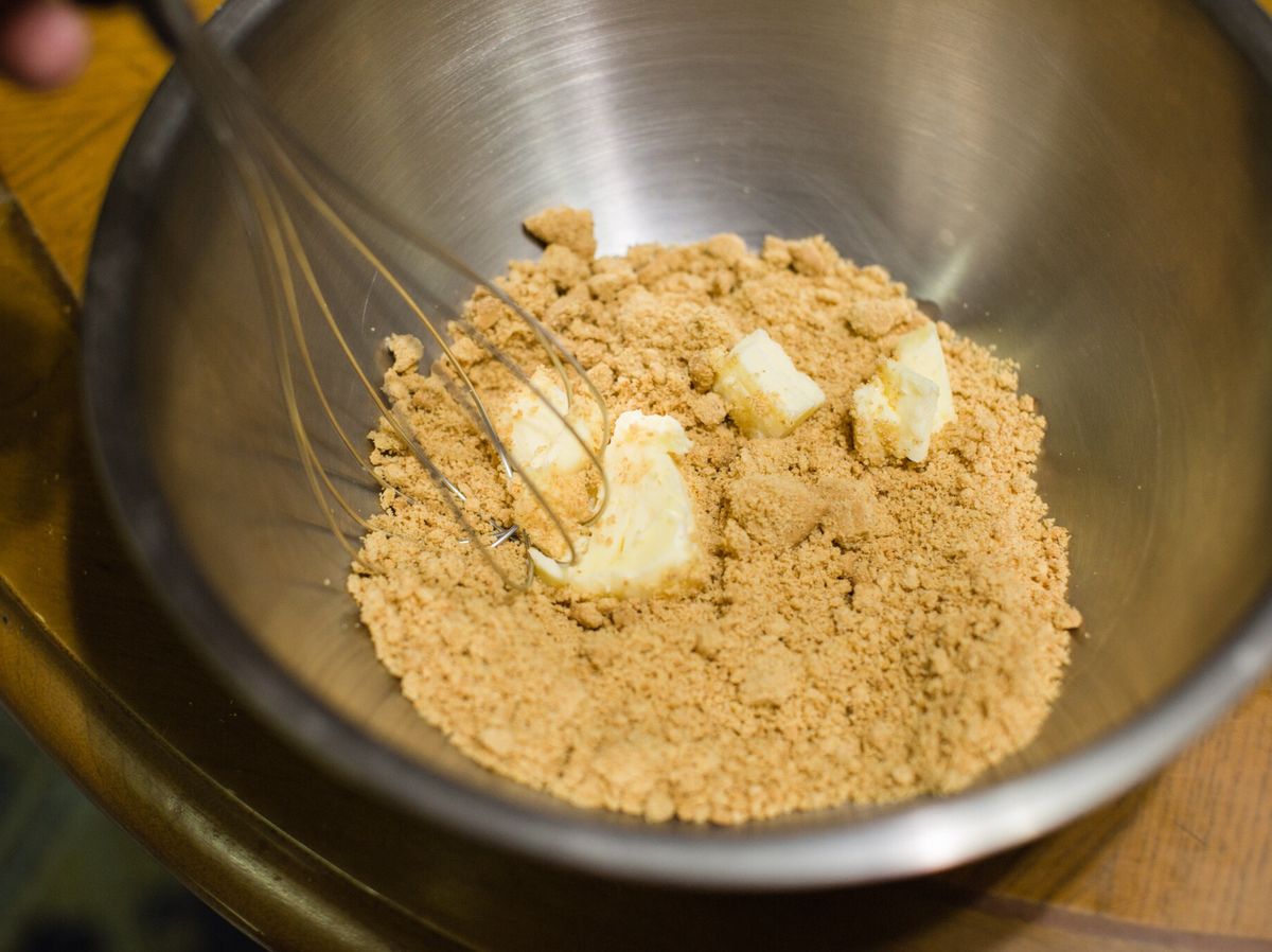 2.無鹽奶油跟壓碎的餅乾拌勻混合