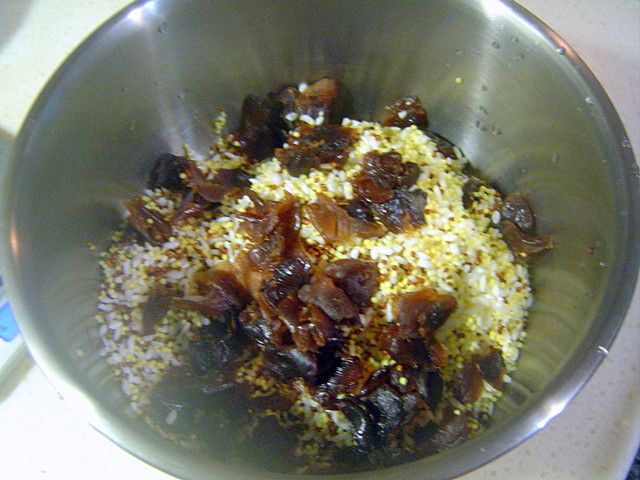 3. 將桂圓肉剝開後一一加入浸泡好的長糯米、小米 、紅藜麥中