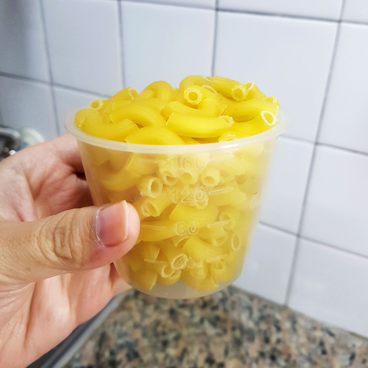 我是廚房新手~常常很難拿捏好煮通心麵的量,又沒有小磅秤, 但發現用 "量米杯" 可以找出適合的量。 我們是兩人小家庭,不算大胃族,但也不是小鳥胃,所以發現一杯剛好1人份,所以 2人 / 2杯,我想比較吃不多的朋友或食材很多,可以 2人/1.7杯。