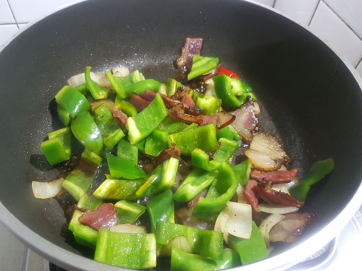 ● 再加入 "青椒" ( ●不愛青椒,這時可以加入高麗菜 ), (中大火)約拌炒1分鐘 ● 這時加入 "醬油+糖" ( 醬油上色用,臘肉有鹹味,所以不用太多 ) ● 恰~~~~(醬油爆香的聲音)