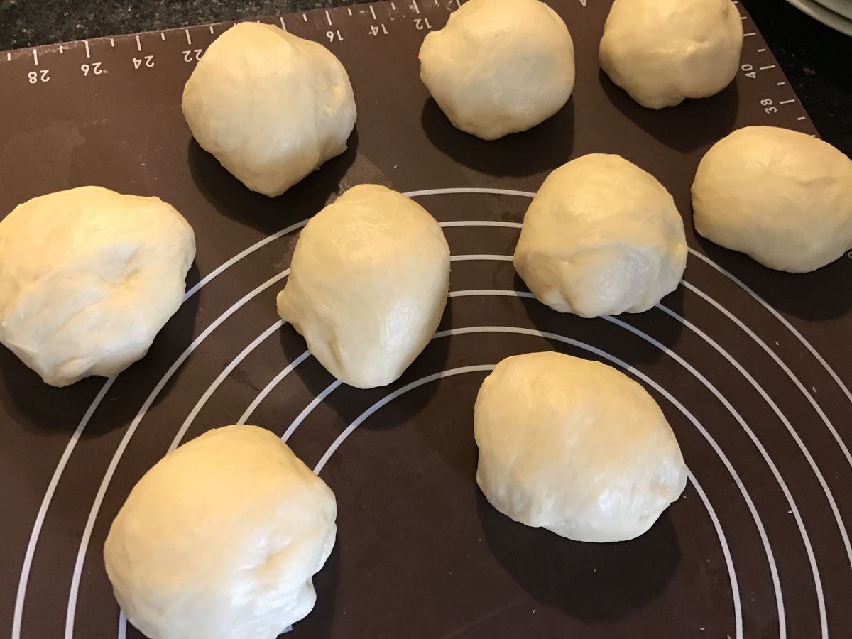 將基礎發酵完成的麵糰分成10等份,整圓,蓋上布鬆弛15分鐘