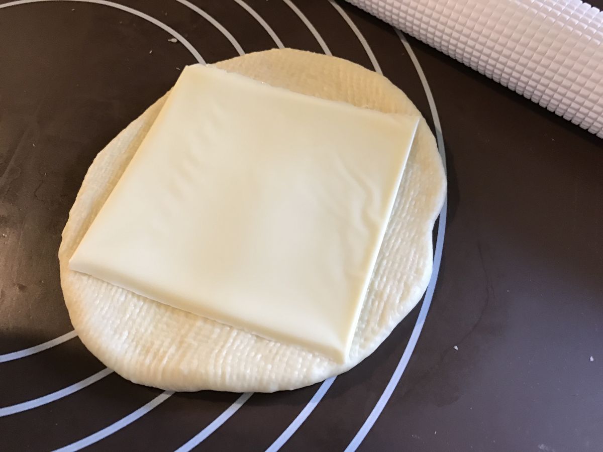 將小麵團四周擀開,放上一片起司片