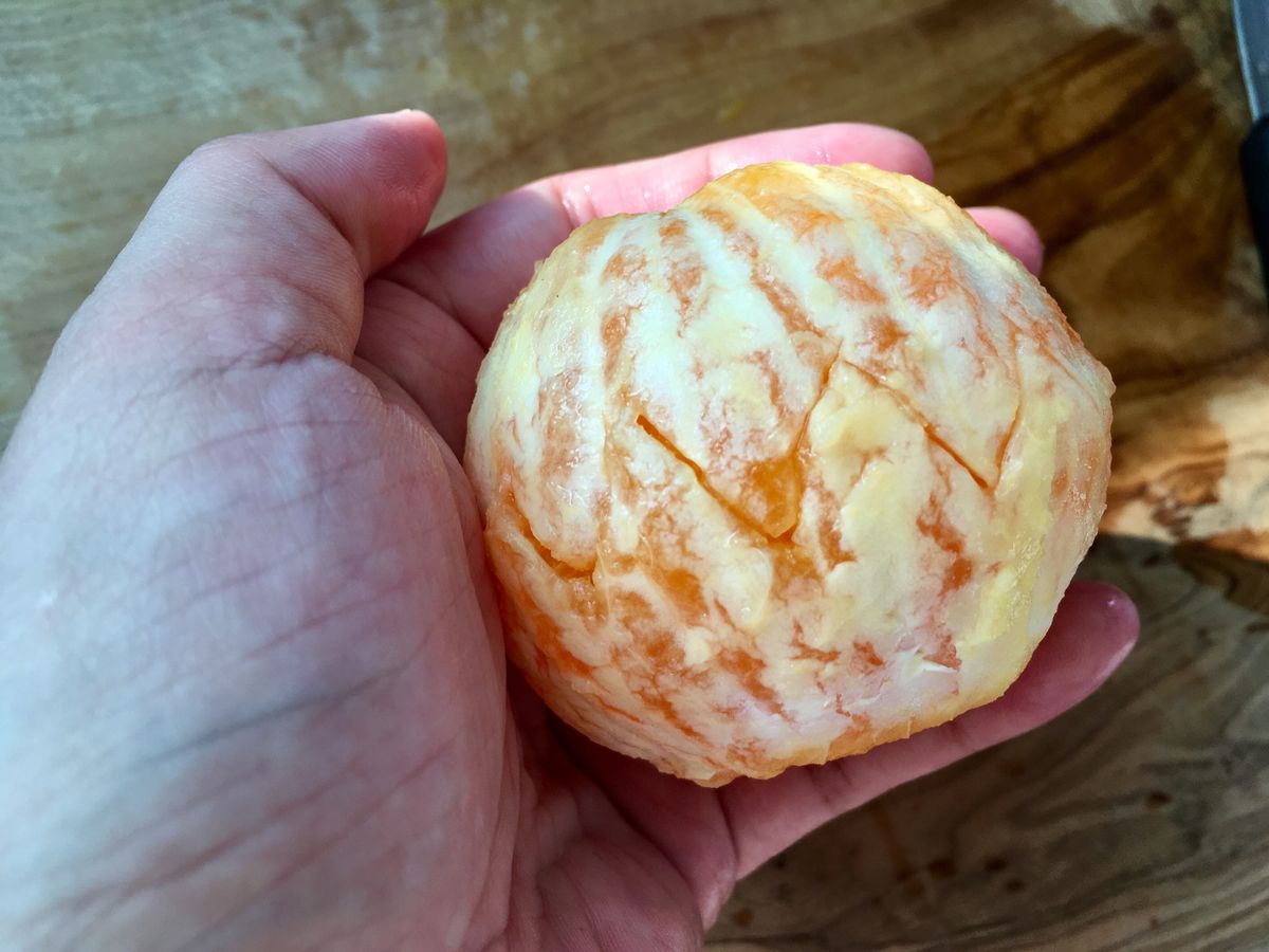 橙去頭尾.剝皮.用小刀切一圈鋸齒狀.要戳深一點.這樣比較好拔開.會遇到籽.拔開時再撥掉就好
