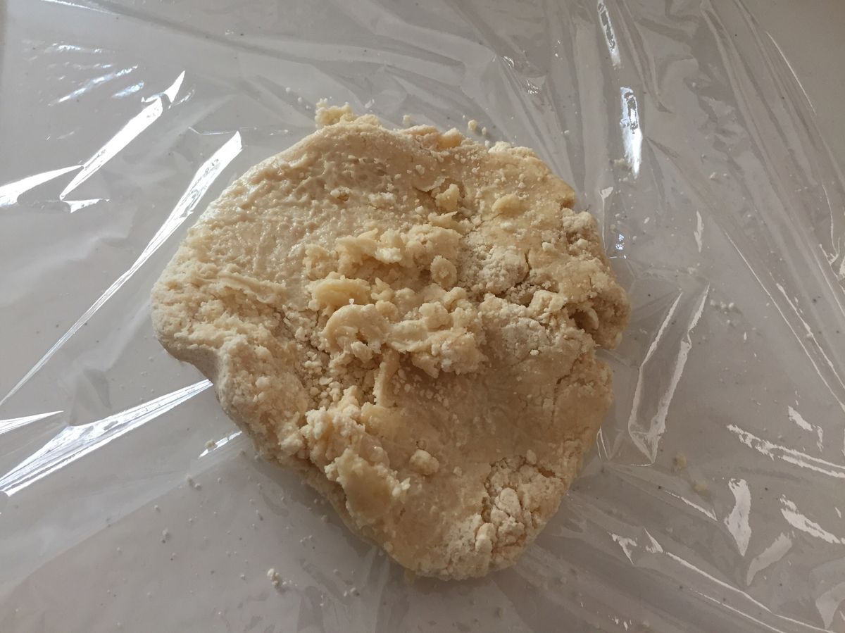 桌上鋪一大片保鮮膜,倒出塔皮,還有粉狀沒關係