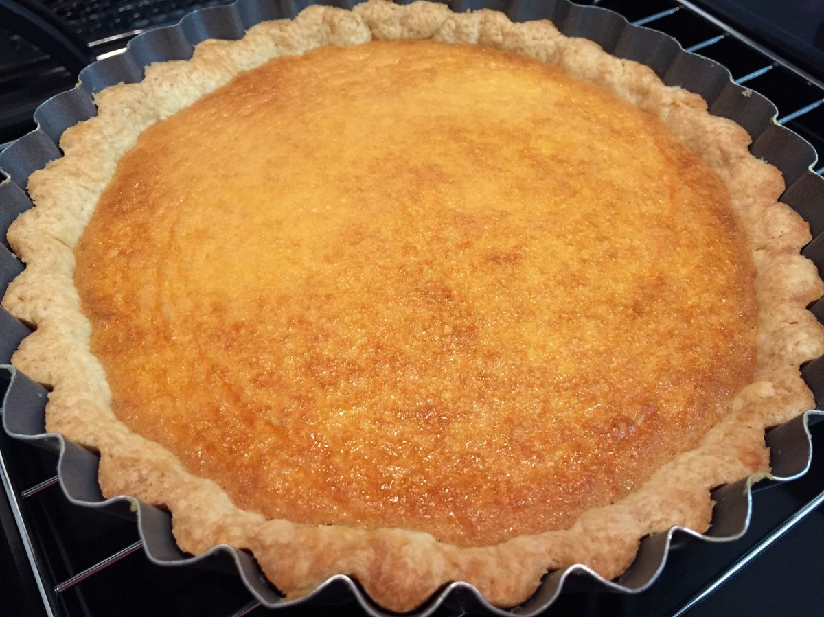 烤模抹上奶油,撒上麵粉然後前後左右搖晃烤模讓麵粉均勻附著,最後拍掉多餘麵粉。取出塔皮,上面再鋪上一層保鮮膜然後桿平到超過塔模。撕掉上層的保險膜,將塔皮反鋪進烤模,隔著保鮮膜把皮輕壓進塔模裡。輕撥去上方多餘塔皮。整型好就放冷藏
