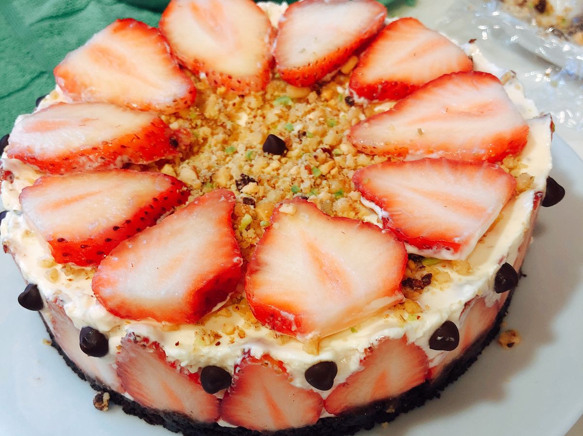 我在草莓片底下鋪了一些打發鮮奶油 邊邊放帶苦的巧克力豆遮一下 封面圖是有鋪鮮奶油的 但對我來說很膩而且蓋過不少乳酪味 所以我只放一點 其實也可以不放 不然買一罐鮮奶油其他地方用不到 開三天就要丟 卻只用一點點 很浪費~