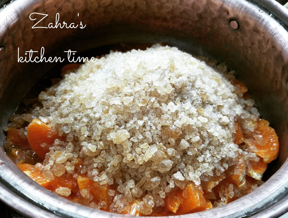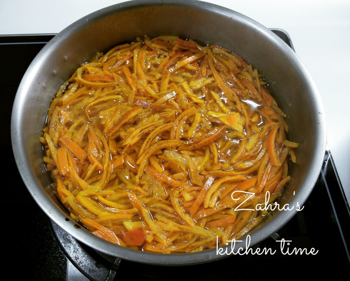 將茂谷柑的皮,去掉內層的白色膜,然後將皮切絲,放入鍋子裡加水煮沸5分鐘,撈起,用水沖一下,擠出多餘的水,再放入2.的鍋內。