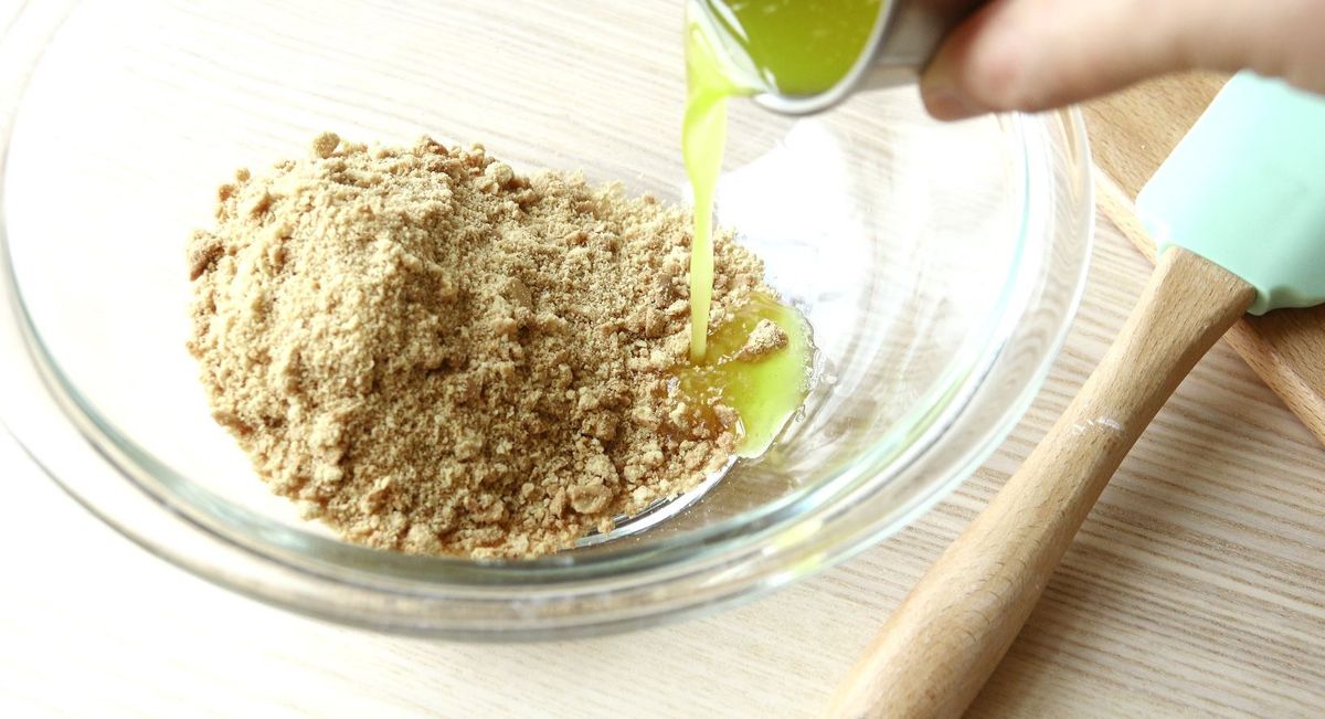 將餅乾碎與奶油拌勻後倒入蛋糕模中壓實