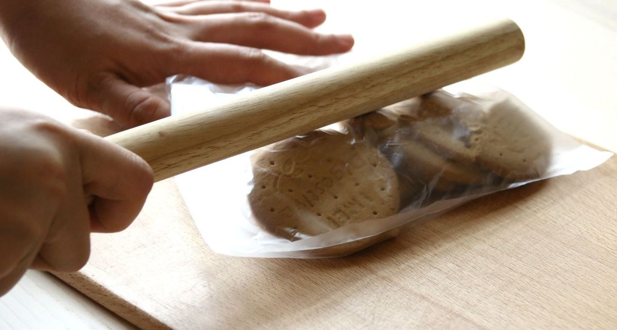 將消化餅乾放進塑膠袋裡,用擀麵棍敲碎,餅乾敲越碎越好,等等放入奶油比較好混和