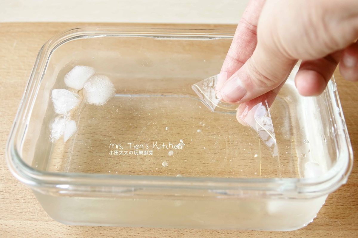 將吉利丁泡軟,加入鮮奶油、砂糖小火加熱至融化即可,倒入作法4裡拌勻
