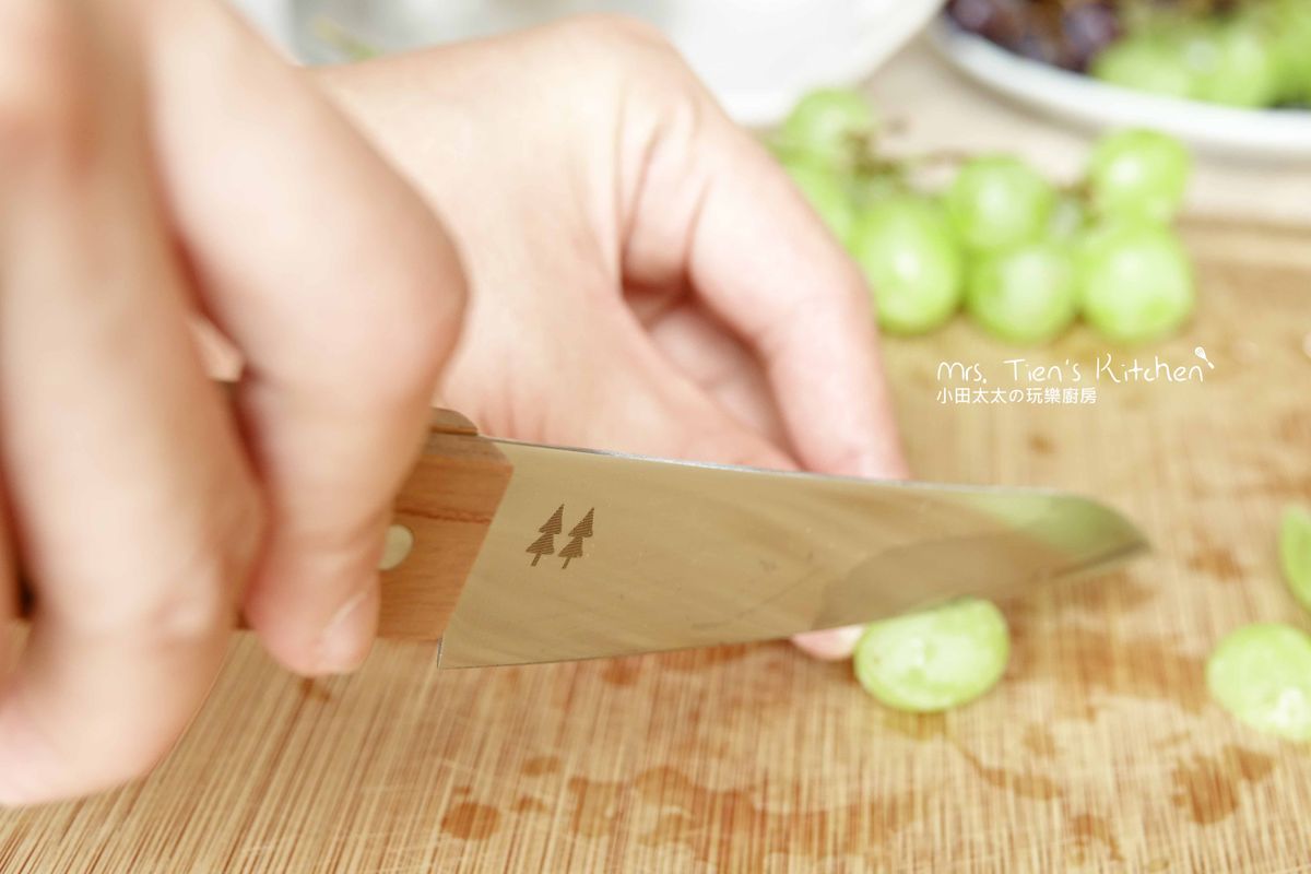 將葡萄對半切開,從外圍開始裝飾蛋糕
