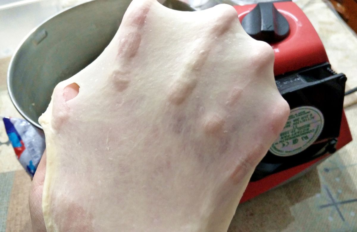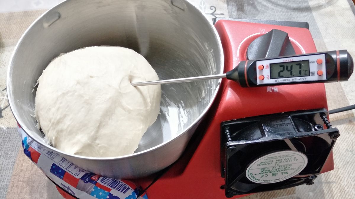 小紅直接法+後鹽法+低溫基發: 缸外用粗的鬆緊帶,塞冰寶打~ 濕性材料慢慢加入~讓麵粉有時間吸收水份哦! 第一圈:鹽、奶油除外,麵團其他食材打一圈(15分鐘)。 第二圈:加入鹽,再打一圈(15分鐘)。 第三圈:加入奶油,打完一圈(15分鐘),完成,麵團終溫 24.7℃。