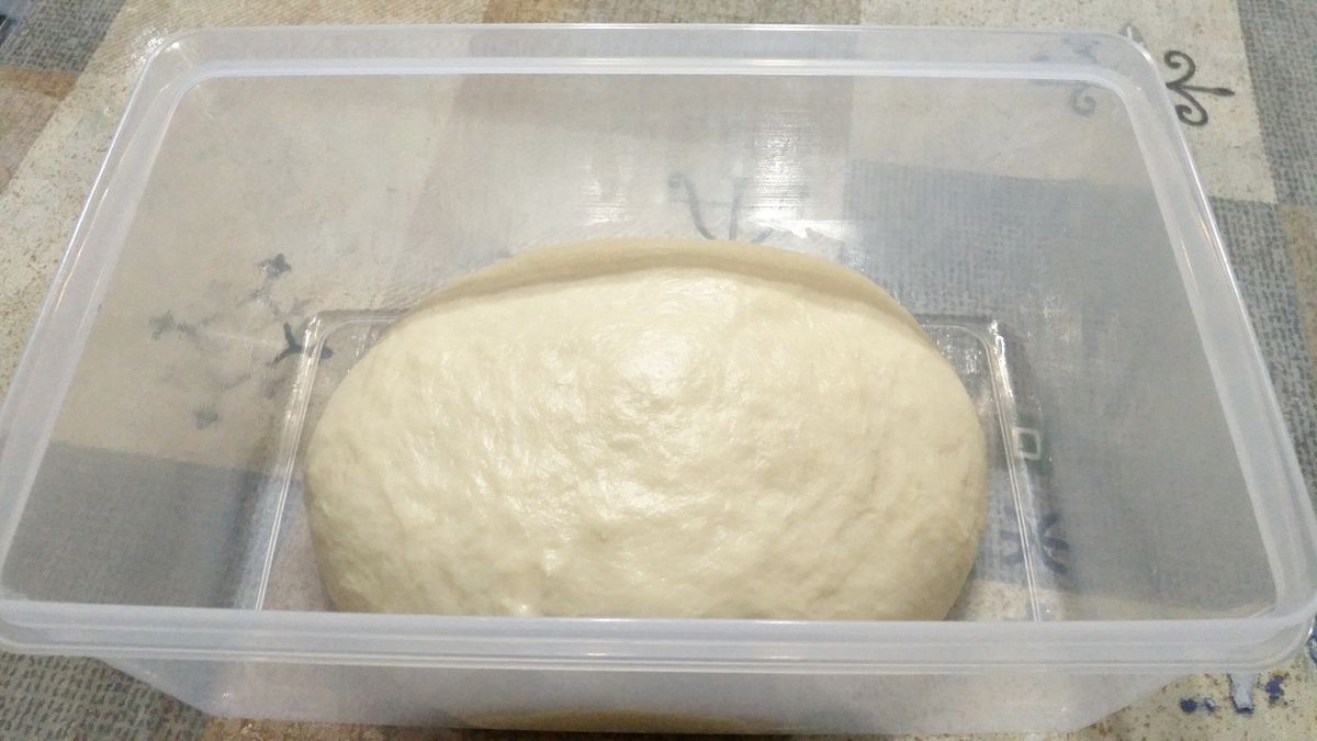 基發:低溫發酵12小時以上。 打好的麵團,放保鮮盒,包一層保鮮膜,再蓋好蓋子,放冰箱冷藏,做第一次的發酵。