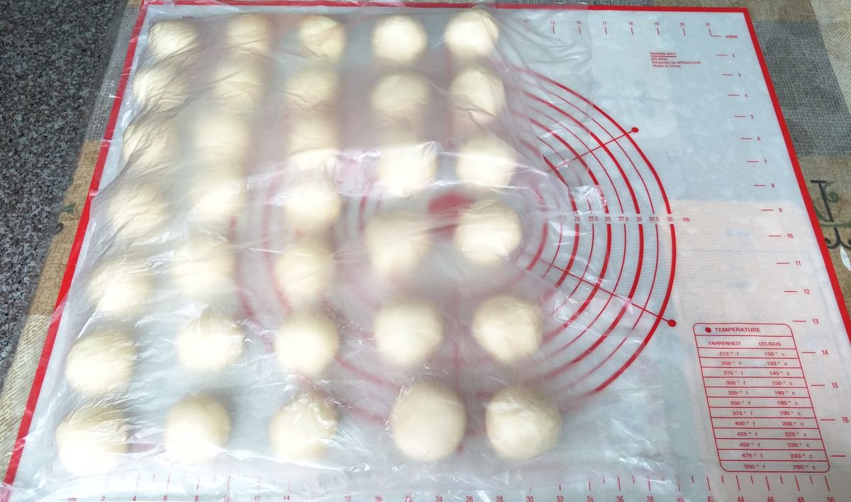 分割:記得蓋上塑膠袋或保鮮膜,避免乾燥哦~ 蔥啊胖胖:@30g共21個=630g,滾圓鬆弛10分鐘。 德國香腸捲捲:@53.6g共12個=644g,滾圓鬆10分鐘。
