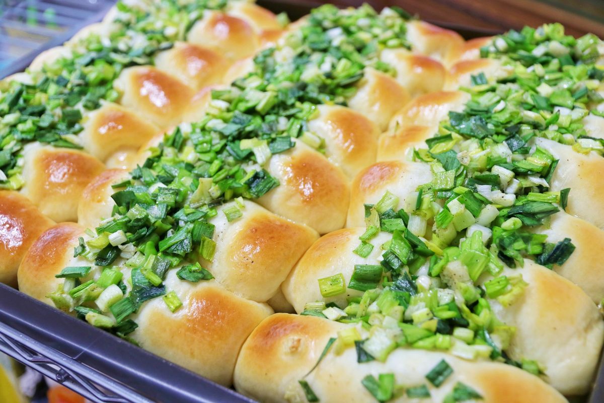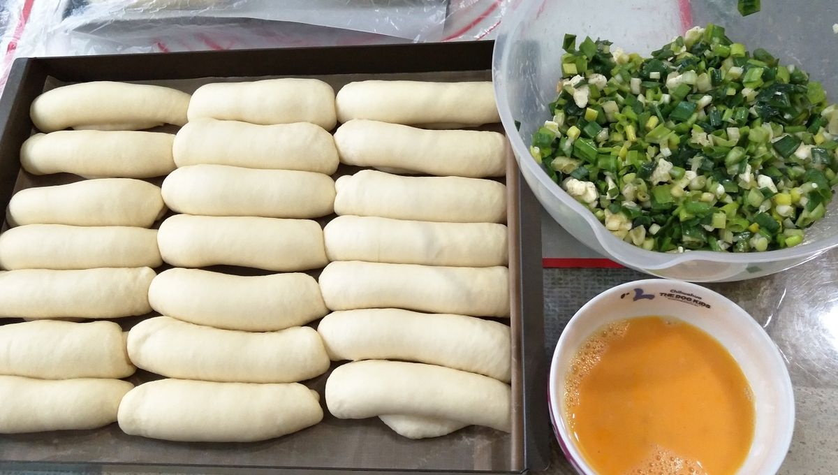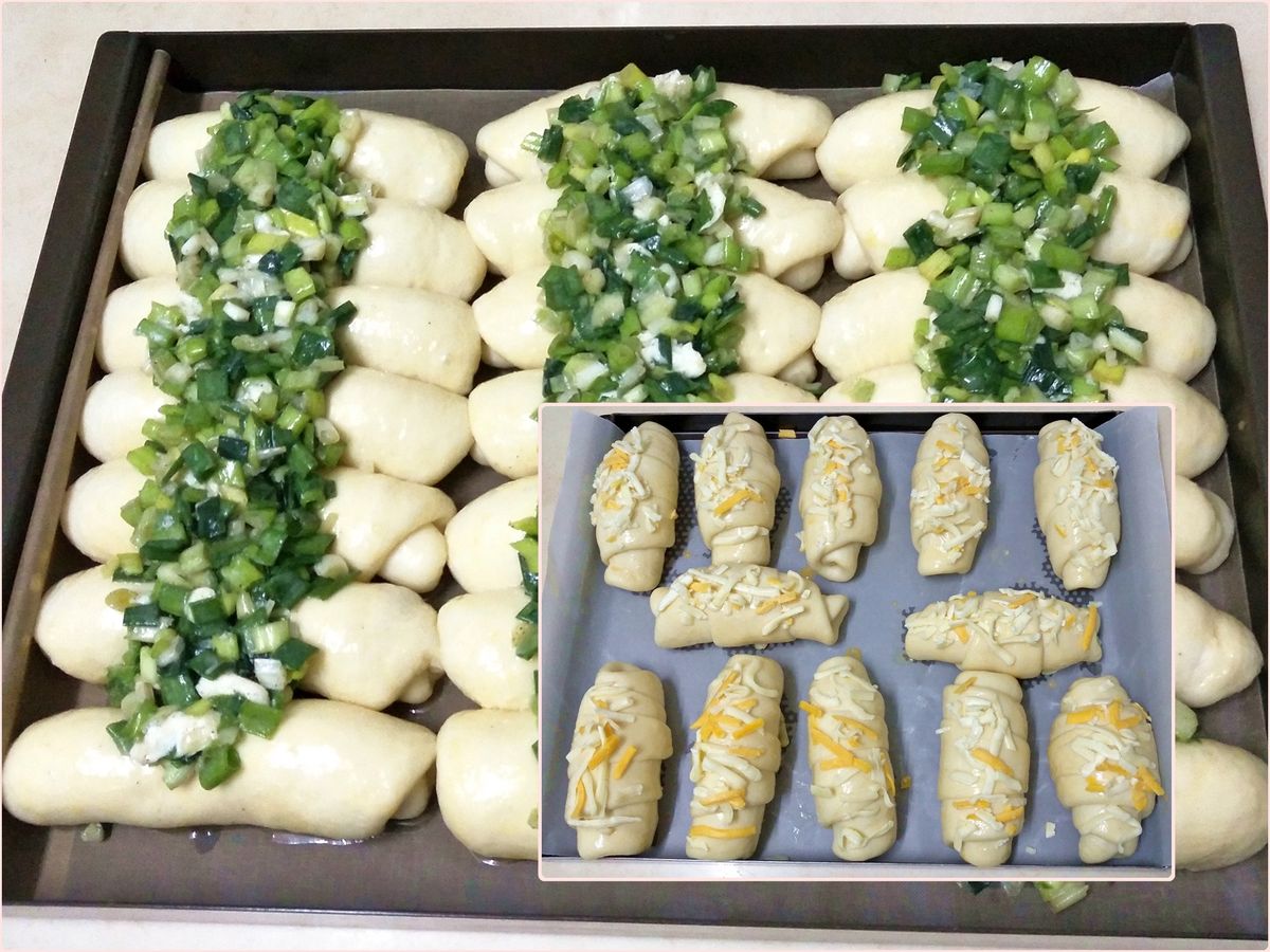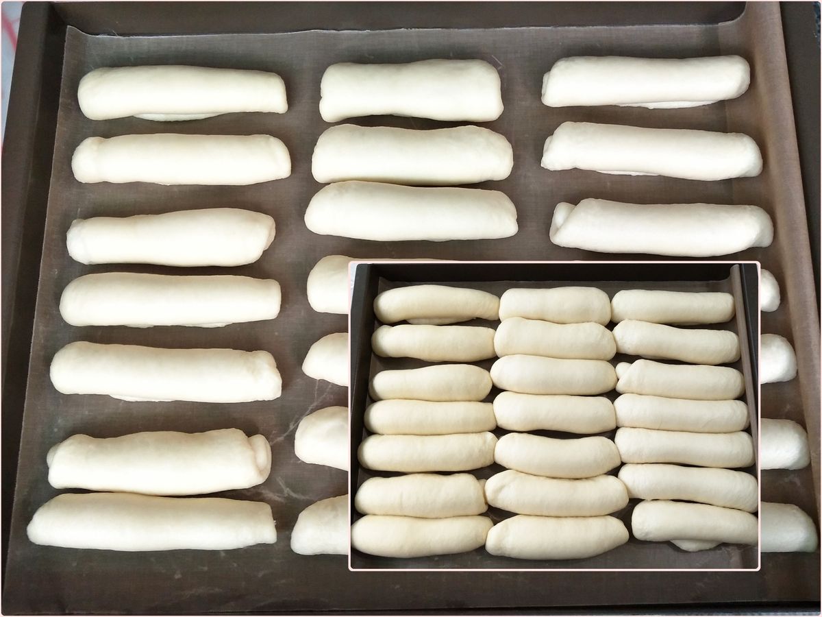 整型: 蔥啊胖胖:擀成橢圓形,翻面(漂亮光滑面放外面),由尖處捲起,收口朝下排進烤盤,一盤放21顆。 德國香腸捲捲:滾成水滴狀,鬆弛15分鐘,再擀成三角長形,寬處包進香腸,捲成可鬆形狀,收口朝下排進烤盤。