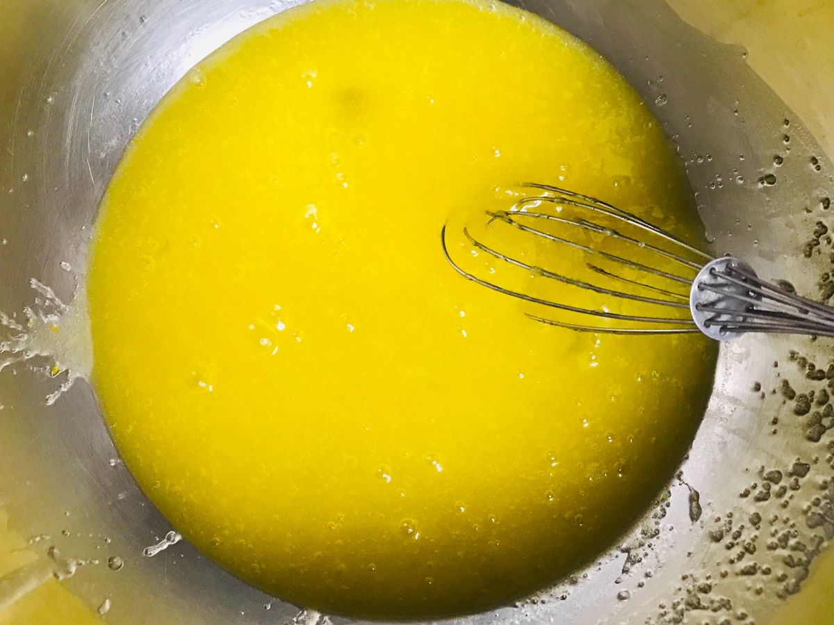 蛋捲 融化的奶油+糖、鹽攪拌, 一次加入一顆蛋拌勻,分三次