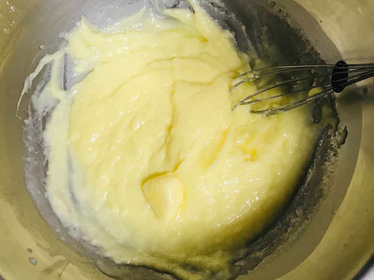 卡士達醬 過篩玉米粉+鮮奶、蛋、砂糖拌勻,開小火煮至濃稠