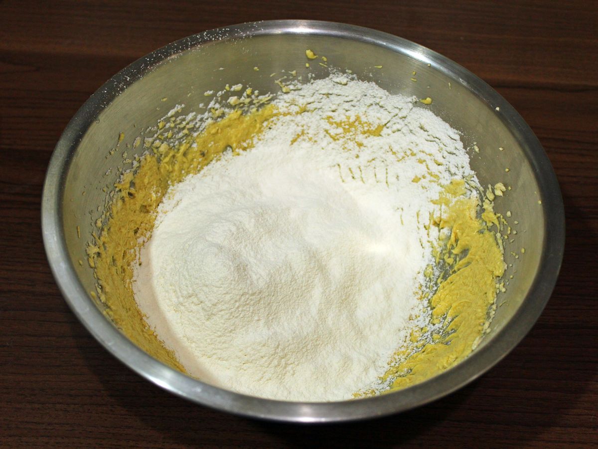 篩入低筋麵粉、泡打粉, 運用矽膠刮刀用切半炒菜方式拌勻
