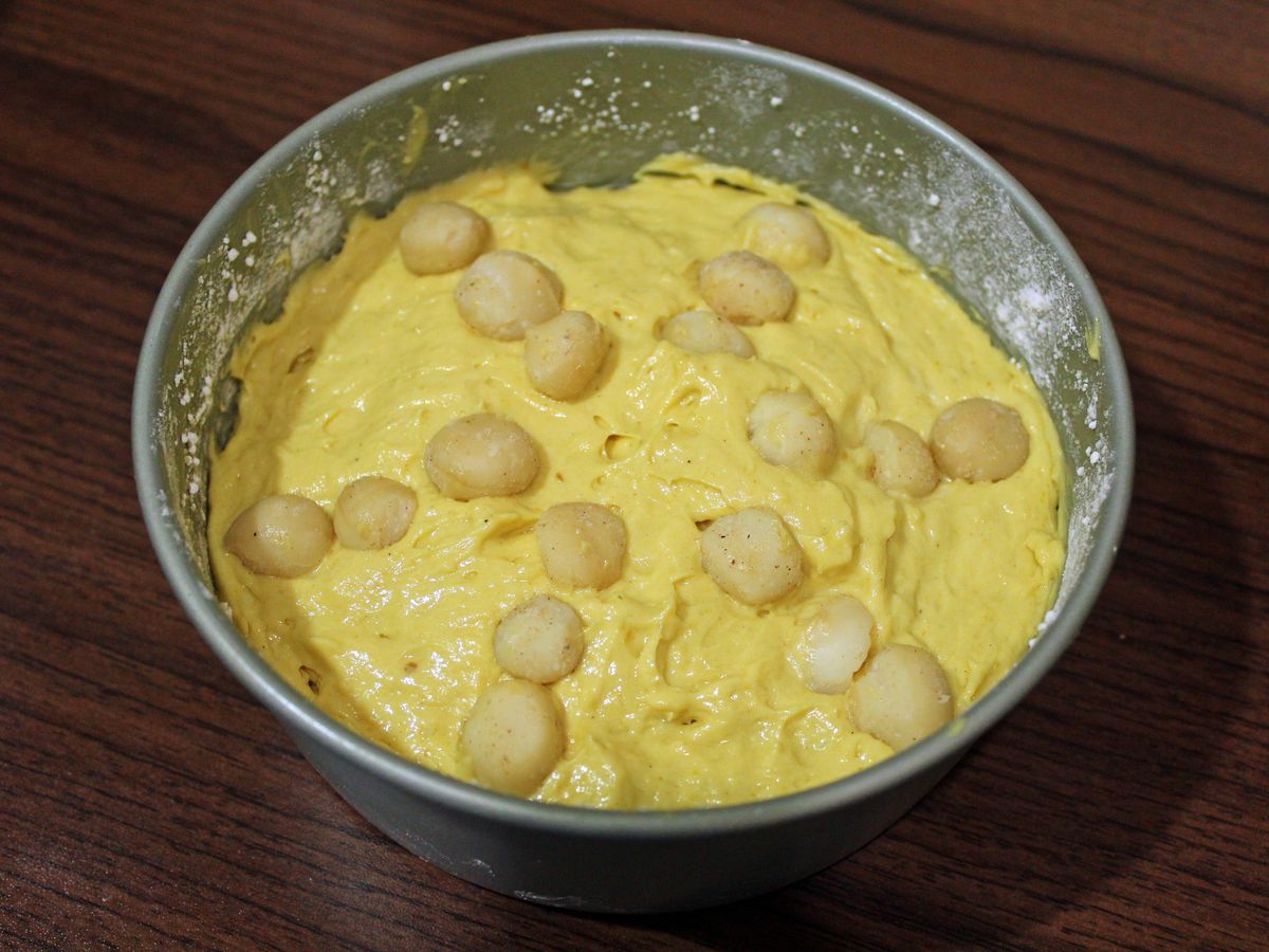 麵糊填入烤膜中, 再抹平表面, 輕震幾下讓裡頭空氣跑出來, 均勻鋪上夏威夷豆