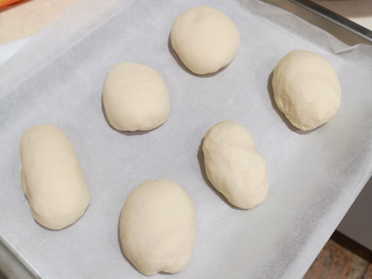 1個小時後,將麵團分成6等份,用桿麵棍雙面壓出空氣,然後整理成橢圓型,準備一杯熱水,放到微波爐中第二次發酵(1小時)。 備註:微波爐只是一個簡易的保溫密閉空間,烤箱也可以。