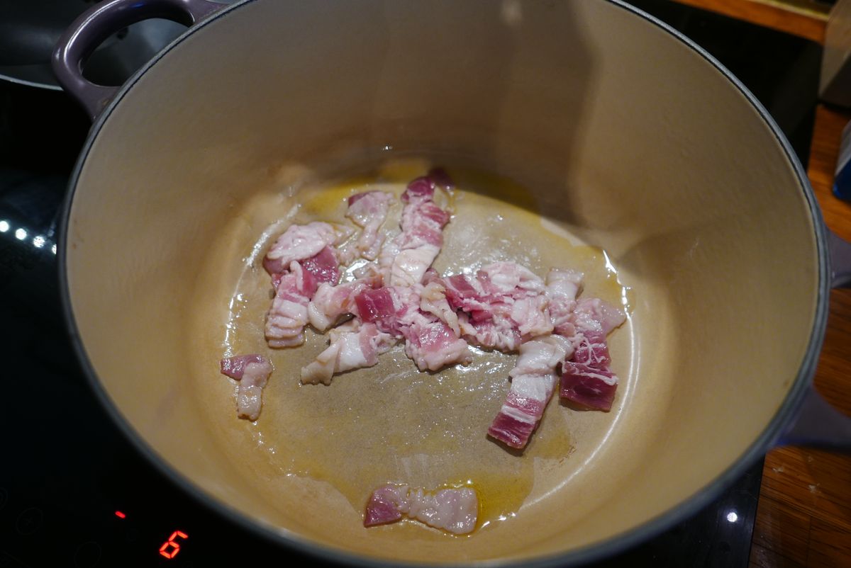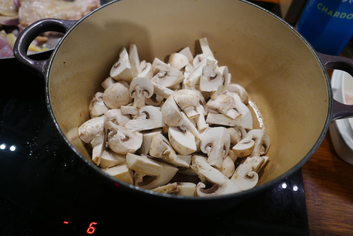放入剛剛切好的雞腿肉,蓋鍋蓋轉大火手放在鍋蓋上感覺到拼拼澎澎的手感就轉中小火燉30分鐘! 正宗的Coq au vin會將蘑菇和培根一起扔下去燉煮,可是這樣煮出來的蘑菇和培根都爛爛的不好吃了,所以我把它們扣留在平底鍋上等等做配菜