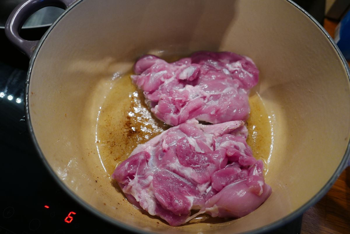 雞腿肉皮朝下煎,煎至表皮金黃再翻面將肉煎至定型即可(等等還要燉不用熟)
