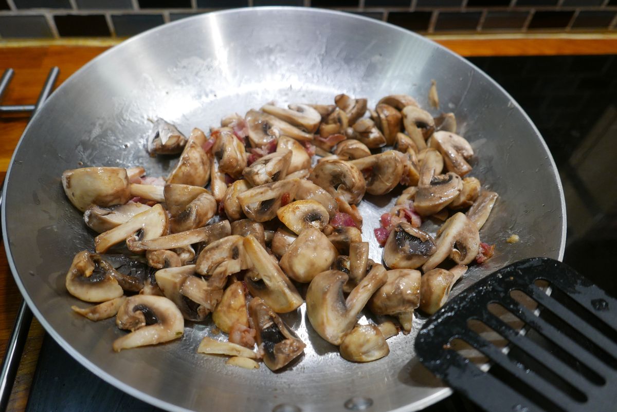 大約拌炒個7~10分鐘蘑菇的香氣出來表面焦黃也略為出水就可以撈出來備用了