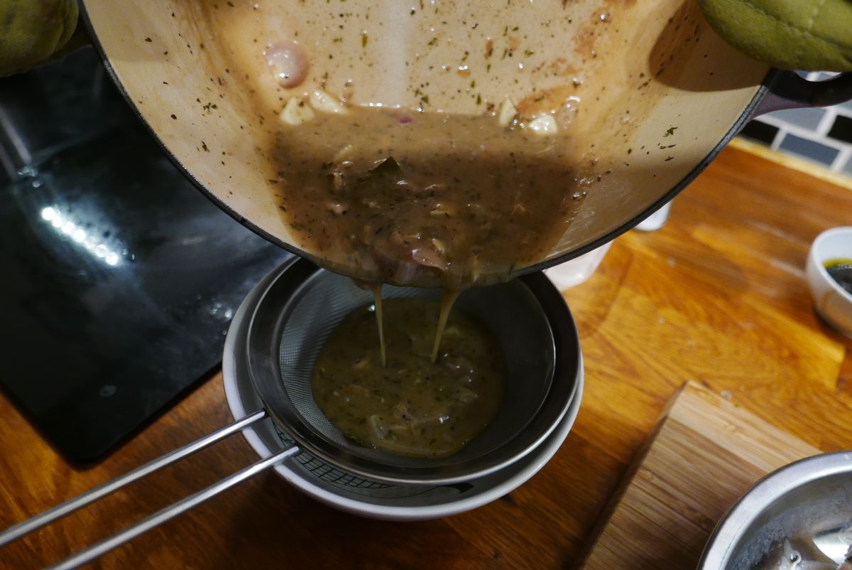 然後叫上家裡那位正在吃雞或者在吃雞路上的壯丁幫你舉起鍋子,準備一個濾網將醬汁過濾出來