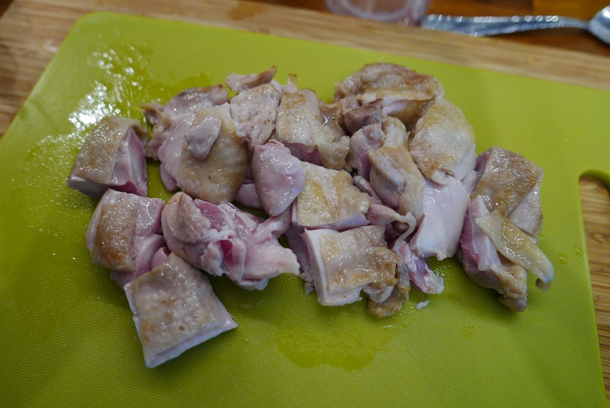 在炒蘑菇的時候把放涼的雞腿肉切塊