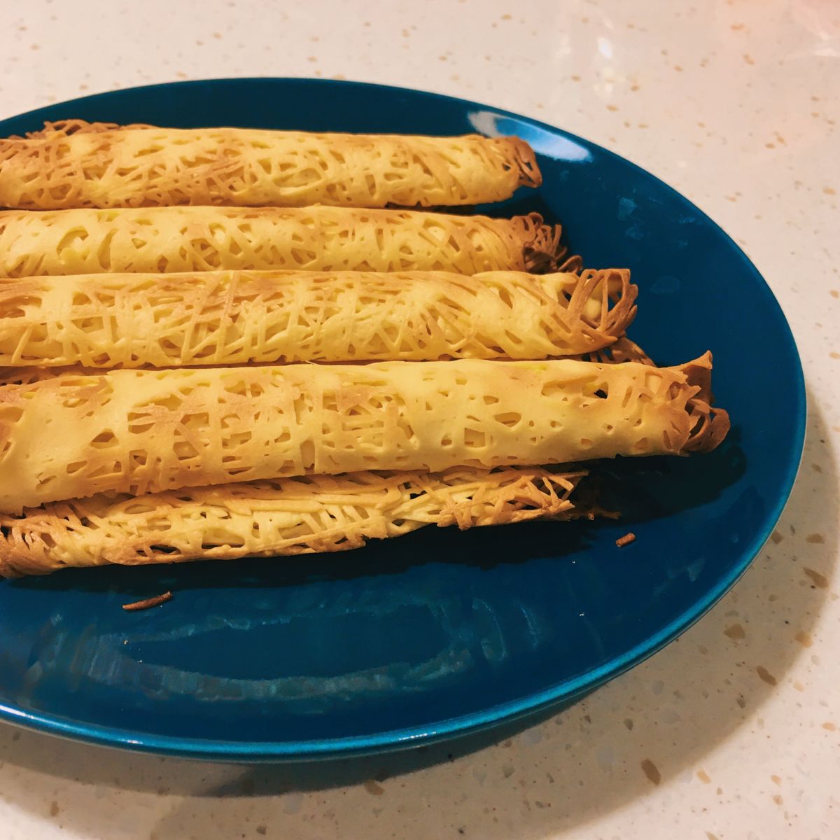 Chill Kitchen 10 食譜 49 粉絲 追蹤 香草公主蕾絲蛋捲 描述 外面買的蛋捲吃完,手指頭總是油膩膩~ 自己動手做,全家吃得愉快又健康噢~ #烘焙 #餅乾 265 說讚 2 一起做 1 留言 讚收藏分享分享FacebookLINE複製連結列印 份量 2 人份 時間 45 分鐘 熱量 VIP 限定功能VIP 獨享 食材 低筋麵粉 100g 細砂糖 40g 無鹽奶油 40g 雞蛋 150g 香草精 3小滴 步驟 食材預備備~ 將無鹽奶油隔熱水加熱至化成一灘奶油 將雞蛋、細砂糖、香草精及無鹽奶油混和均勻 麵粉過篩混進→步驟3 chill chill地將所有食材攪拌均勻再均勻 將步驟5倒入擠花袋,嘴巴剪開一個hen小hen小的洞 開小火,將步驟6一絲一絲地擠入不沾鍋 稍微定型時,速速鏟起來放到砧板上,捲起來~ 重複動作到食材用完為止 來人,送進烤盤裡! 烤箱上下火150°C,烤它個10分鐘 今日主題是公主蕾絲蛋捲 那麼右下角兩支就是王子蛋捲了(少婦腰很痠啊) 來,公子吃蛋捲啊~ 真香 小撇步 ■步驟7要注意不能停留太久,硬掉就捲不了啦~ □不同烤箱的溫度不大相同,烤的期間還是要觀望觀望,以免燒焦~ 1.1 萬 瀏覽 2019/11/09 發表