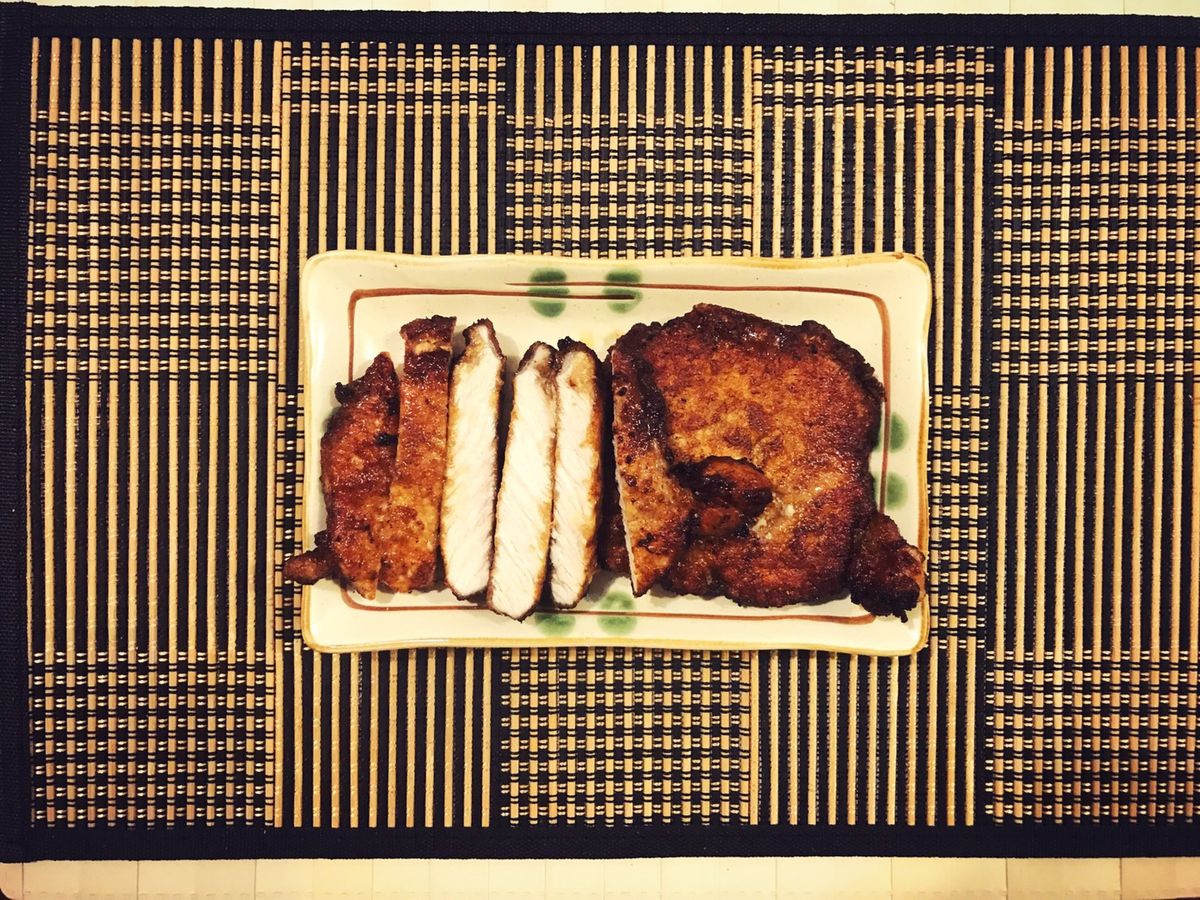 放入筷子測量油溫,筷子四周起泡時,將火轉小,加入豬排,不需急著翻動