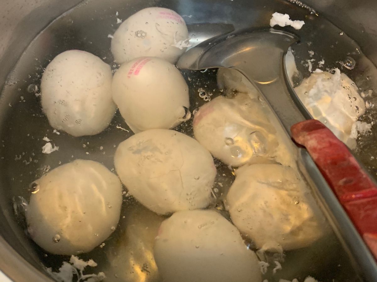 雖然做過很多次,但每次還是會有一、兩個蛋會剝不好使蛋黃露出或是比較熟的情況,如果想要追求完美,最好的方法就是少量的煮蛋(一次五顆)