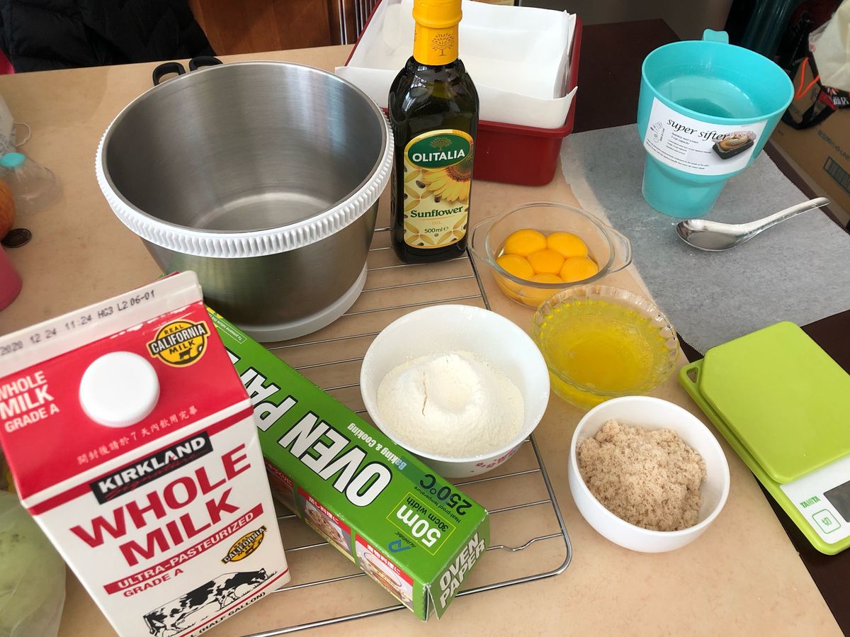 玄米油加熱到有油紋(約80度左右)關火加入低筋麵粉攪拌,拌勻後加入鮮奶,最後將蛋黃加入拌均(蓋上一塊布減少蛋黃糊接觸空氣太久表面會有硬硬的膜)