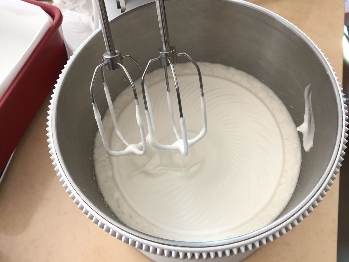 開始打蛋白囉!盆子裡要乾淨不能有油或水,加入蛋白...三溫糖分三次加入,電動攪拌器攪拌至蛋白有彎勾,溼性發泡即可
