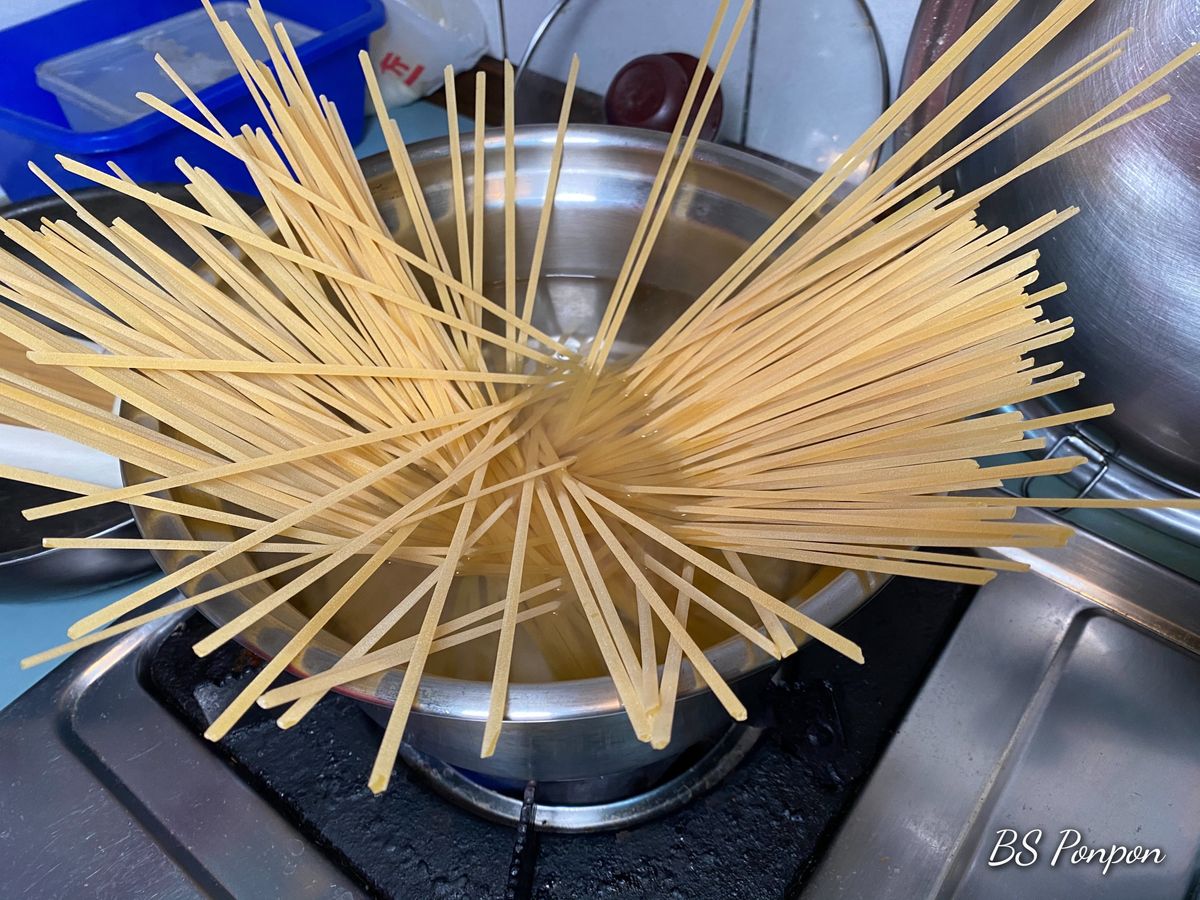 煮義大利麵前先加入一匙鹽&少許橄欖油,讓煮麵過程中維持麵條口感,煮麵時間大約8~10分鐘左右