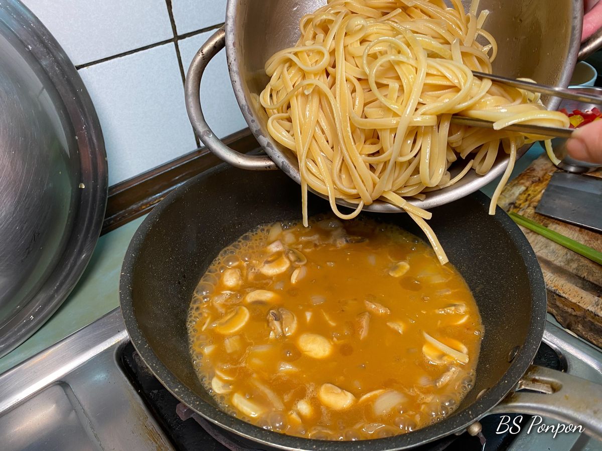 倒入退冰的龍蝦濃湯,中小火煮滾,鍋中加入煮好的義大利麵,然後開始翻炒直到醬汁與麵條均衡結合,沒有硬性規定要煮多久,就看個人喜歡濕潤或乾爽口感而定