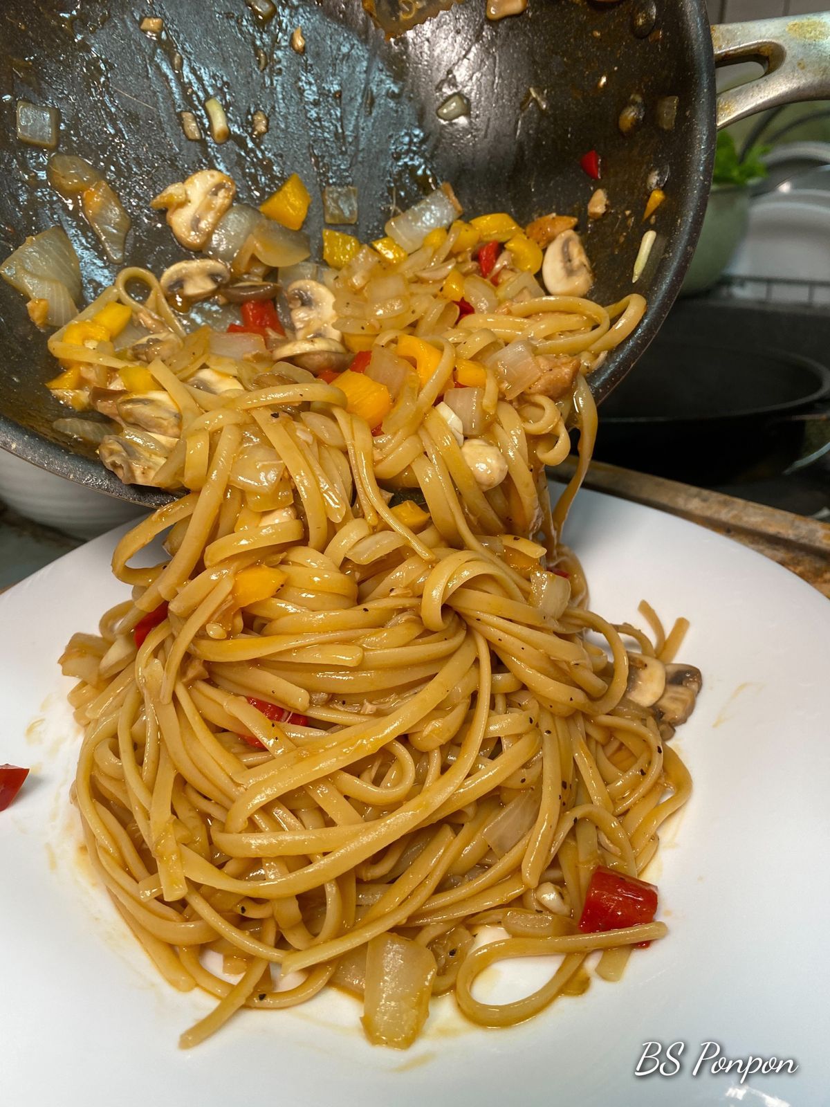 最後加入紅/黃椒配色,翻炒10~15秒即可關火