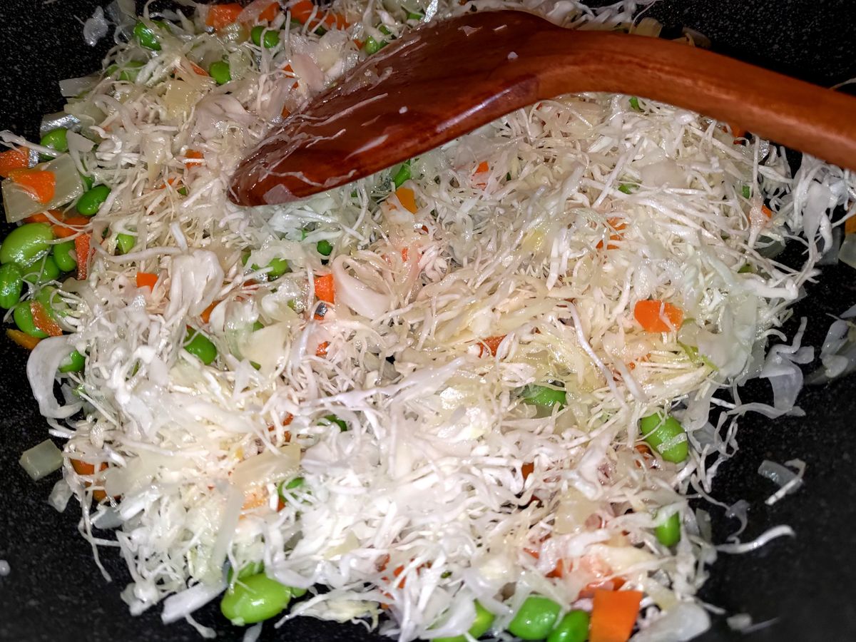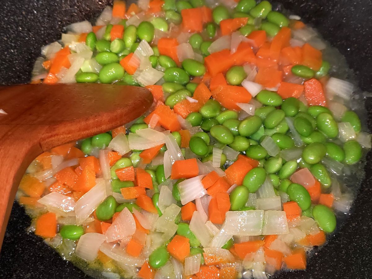 毛豆放入,若是冷凍毛豆仁,事先要用冷水洗2-3次,幫助解凍 加入少量的水(只要到食材的底部範圍就可以),過程盡量把料往中間集中,讓下層接觸到水,翻動2-3次即可,翻完再往中間集中,讓蔬菜都炒熟