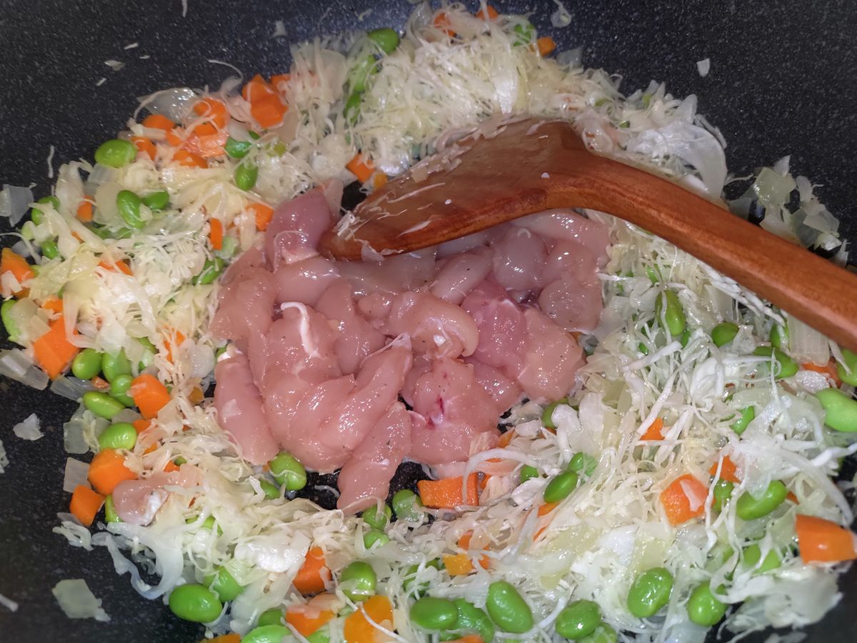 高麗菜熟了以後,把菜往旁邊撥開,瓦斯的火用中小火,中間鍋底倒少量橄欖油,雞肉放進去炒, 只要小心翻動雞肉,盡量不要撥到旁邊的菜,火的範圍也和雞肉範圍差不多即可。