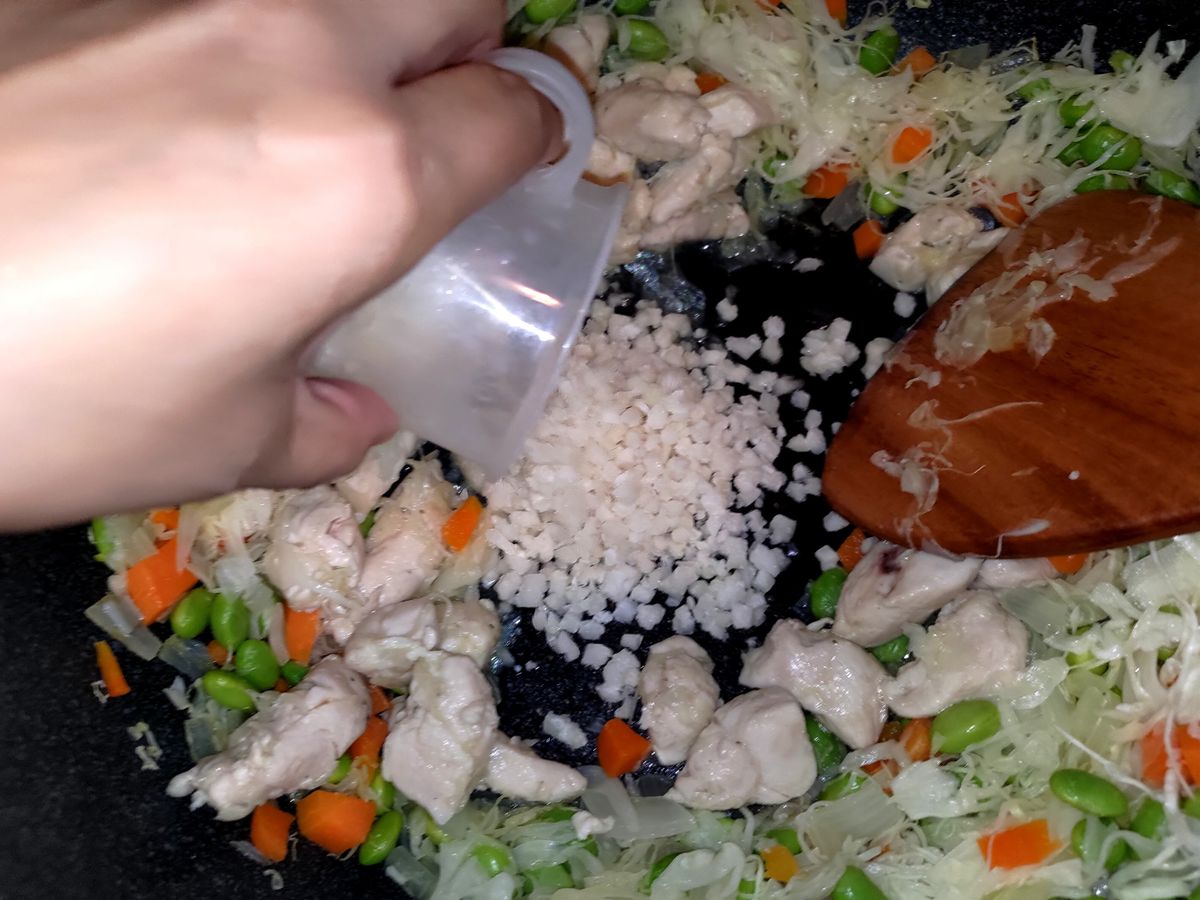 雞肉也往旁邊撥開,倒入花椰米,用一樣的方式炒到花椰米變軟,熟透