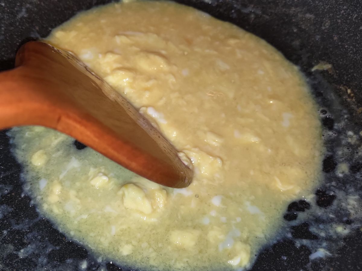 6顆蛋、鹽半小匙,牛奶,一起打成蛋液, 鍋子倒橄欖油,用小火,炒的時候用煎匙攪拌蛋液