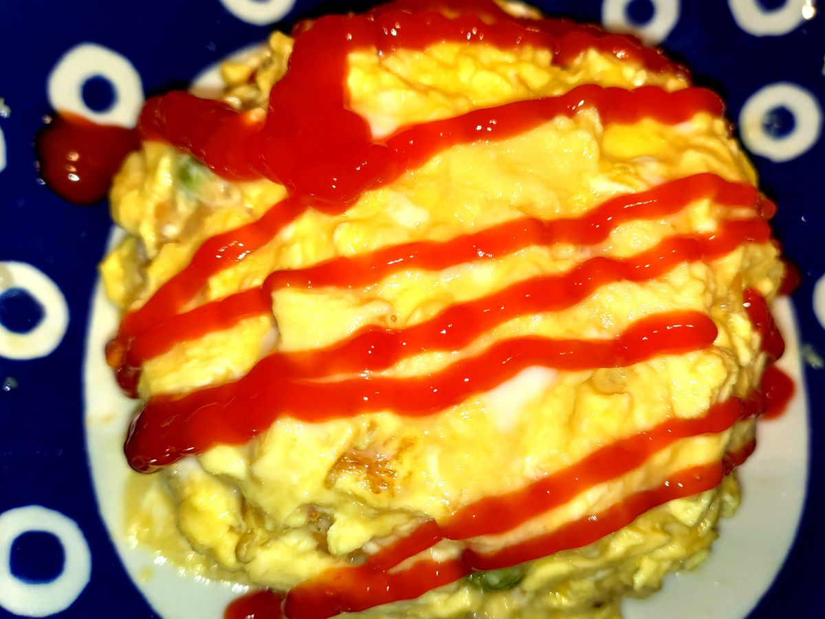 用湯匙撈出蛋,均勻舖在飯上,可以像抹奶油一樣輕輕抹開來塑型,完成後上面依喜好擠上番茄醬