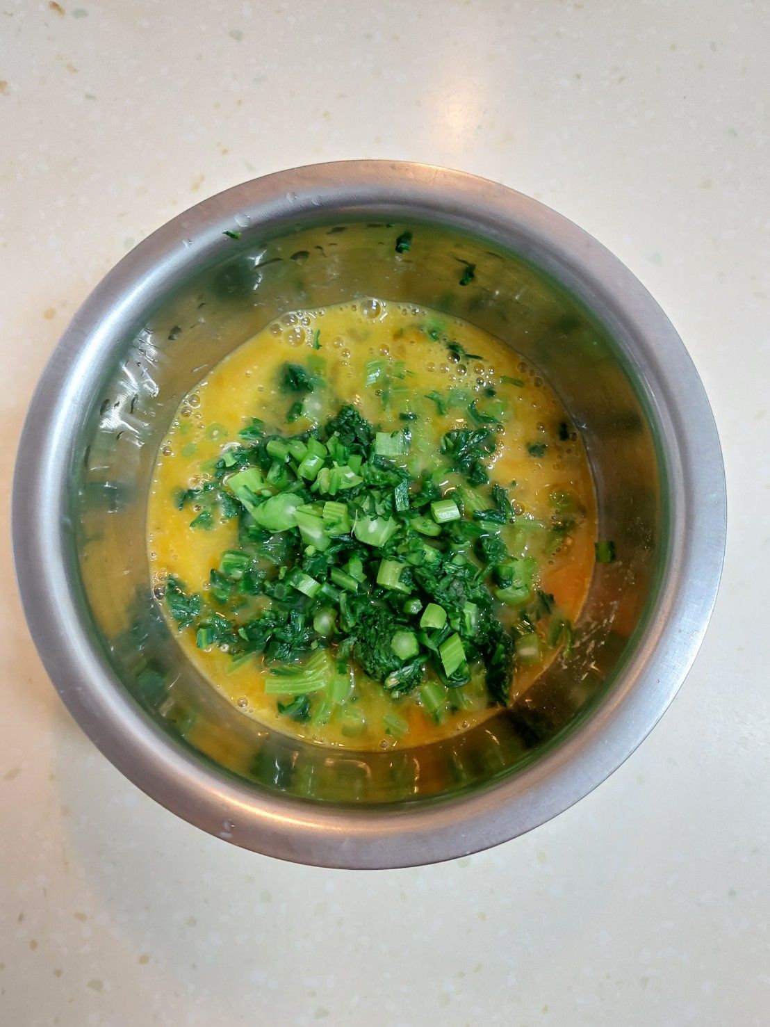 雞蛋加鹽、味精、胡椒調勻,加入山茼蒿