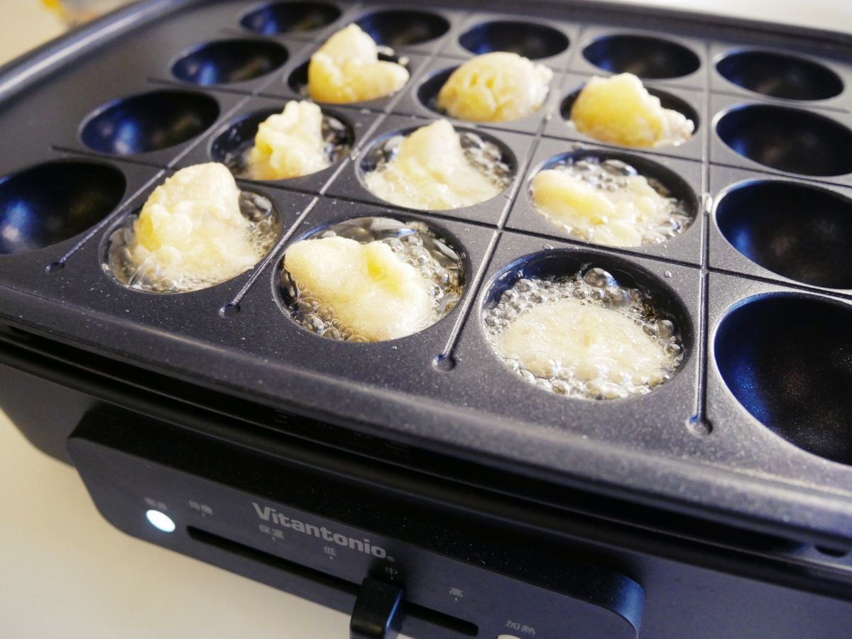 菱角裹上麵糊後放入電烤盤油炸至兩面金黃即可。